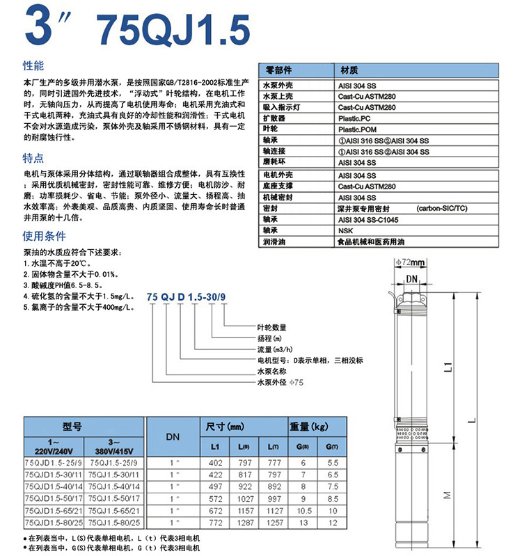 1、上奧牌75QJ井用潛水泵葉輪、導流體采用PC或POM(聚碳材料)及俗稱“賽鋼”的聚甲醛高分子耐磨材料,進行沖壓、壓注制造而成,耐磨性強、抗氧化、經久耐用,并具有不生銹、無污染的特點。