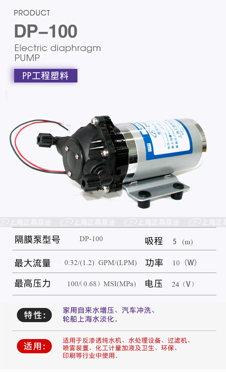 DP微型電動(dòng)隔膜泵適用于家用自來水增壓、汽車沖洗、輪船上海水淡化,DP隔膜泵適用于反滲透純水機(jī)、水處理設(shè)備、過濾機(jī)、噴霧裝置、化工計(jì)量加液及衛(wèi)生、環(huán)保、印刷等行業(yè)中使用。
