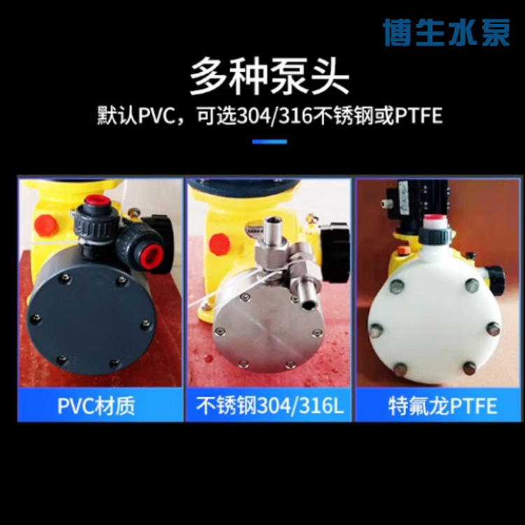 3、接觸介質泵頭為PVC、可選PTFE、及不銹鋼材質。