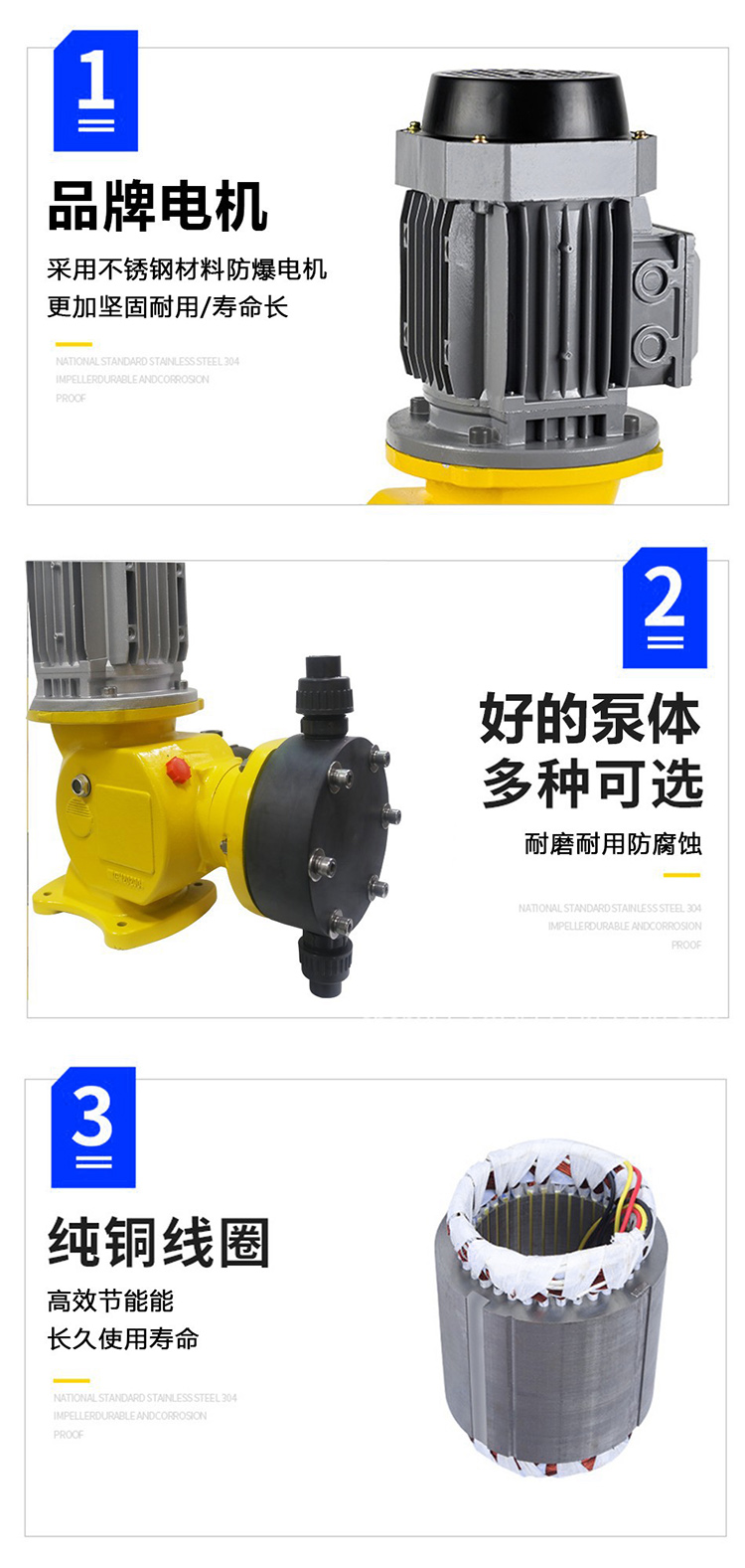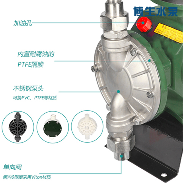 3、接觸介質泵頭為PVC、可選PTFE、及不銹鋼材質。