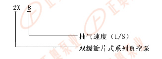 例如:2X-8    2 - 代表雙級   X - 代表旋片式真空泵     8 - 每秒鐘抽氣速率為8