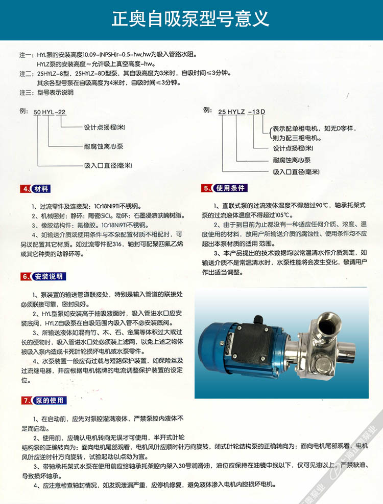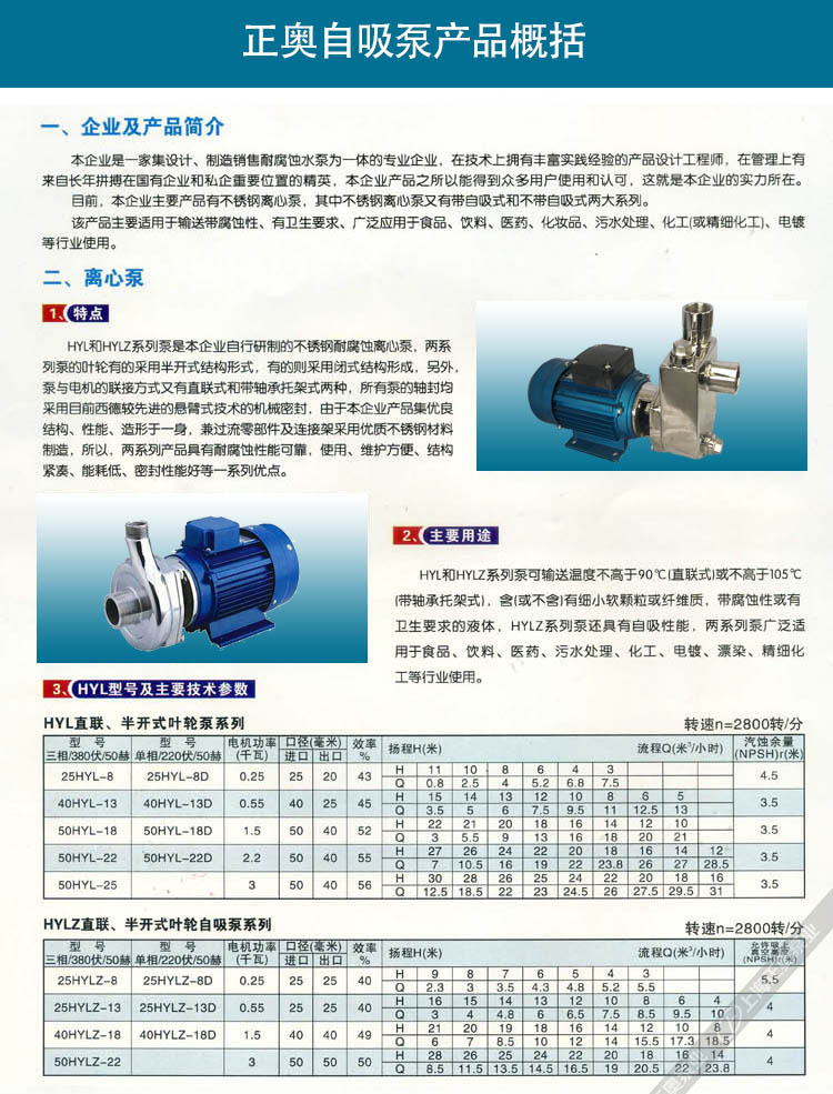 HYLZ系列正奧不銹鋼耐腐蝕離心自吸泵,采用優質不銹鋼為主料,以西德技術的機械密封為軸封,對輸送不同的介質,我們采用半開式和閉式結構兩種不同的葉輪,及泵與電機的聯接方式有直聯式和帶軸承托架式兩種。此泵擁有結構優良、耐腐蝕性可靠,密封性能好,使用維修方便,能耗低,輸送溫度不高于90℃(直聯式),或不高于105℃(帶軸承托架式),含(不含)有細小軟顆粒或纖維質,帶腐蝕性或有衛生要求的液體的理想選擇。