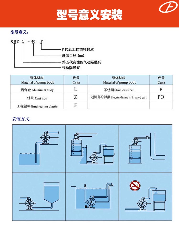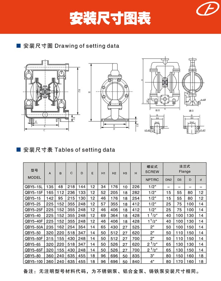 流體部件材質有:鋁合金、鑄鐵、聚丙烯、不銹鋼、隔膜根據不同膜片材質分別有:丁晴橡膠、氯丁橡膠、聚乙烯、聚膠、聚醚橡膠、氟橡膠、氟塑料、特氟隆。以滿足不同液體介質的需要。