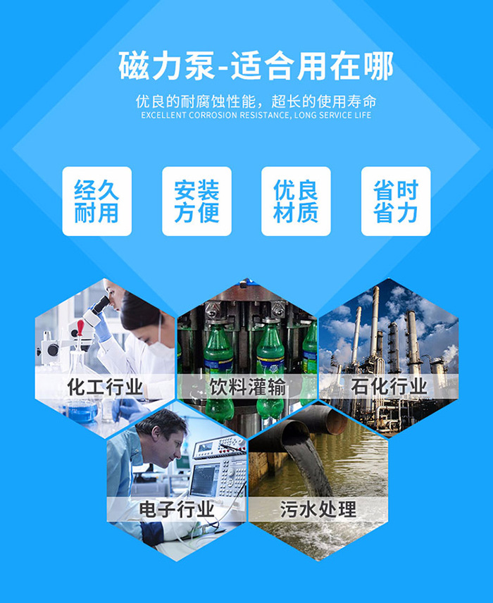 不銹鋼磁力泵結構緊湊、外形美觀、體積小、噪音低、運行可靠、使用維修方便。可廣泛應用于化工、制藥、石油、電鍍、食品、電-影照相洗印、科研機構、國防工業等單位抽送酸、堿液、油類、稀有貴重液、毒液、揮發性液體,以及循環水設備配套、過濾機配套。特別是漏、易燃、易爆液體的抽送,選用此泵則更為理想。