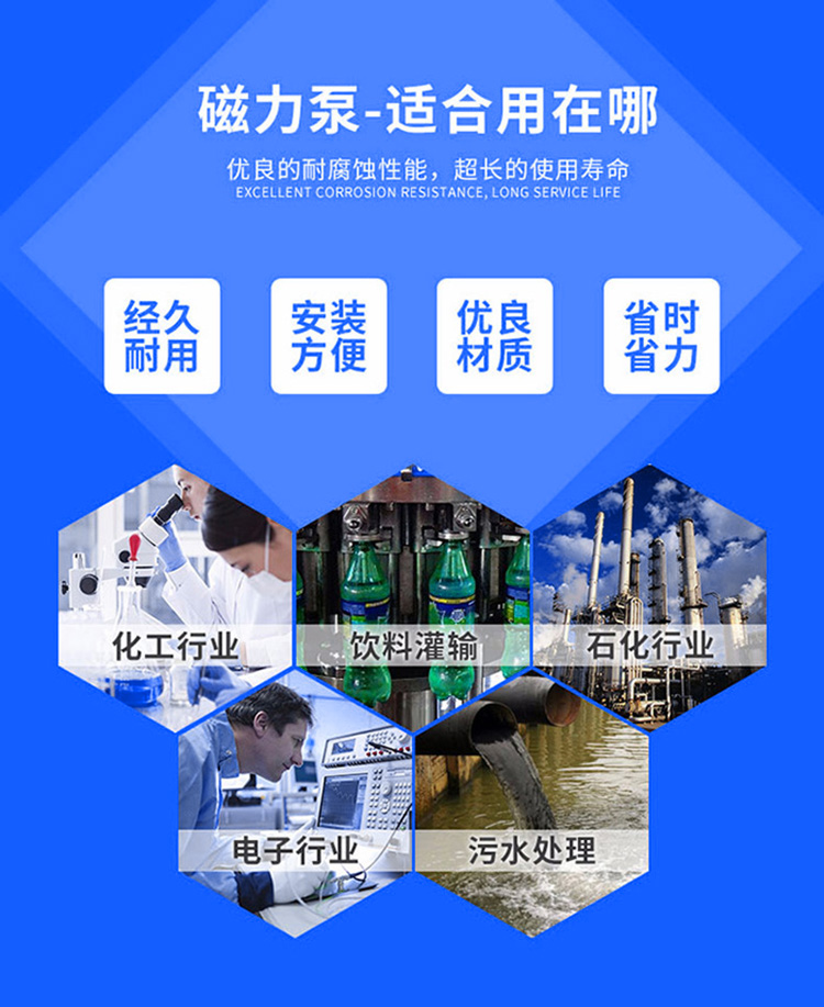 磁力泵結構緊湊、外形美觀、體積小、噪音低、運行可靠、使用維修方便。可廣泛應用于化工、制藥、石油、電鍍、食品、電-影照相洗印、科研機構、國防工業等單位抽送酸、堿液、油類、稀有貴重液、毒液、揮發性液體,以及循環水設備配套、過濾機配套。特別是漏、易燃、易爆液體的抽送,選用此泵則更為理想。