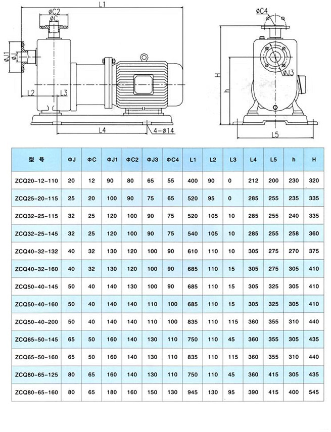 ZCQ自吸磁力泵采用外混式軸向回水泵體結構,泵體由吸液室、儲液室、蝸殼、回流孔、氣液分離室等部份組成,結構見圖。泵啟動   后,在離心力的作用下,吸水室中的剩余液與進液管路中的空氣被葉輪攪拌成氣水混合物,混合物經蝸殼進入氣液分離室,隨著速度減慢,導致氣水分離,空氣由泵出液口排出,液經回水孔返回泵內,經過多次循環,進液管道中的空氣被排凈,使泵內形成一定的真空度,達到自吸的作用。