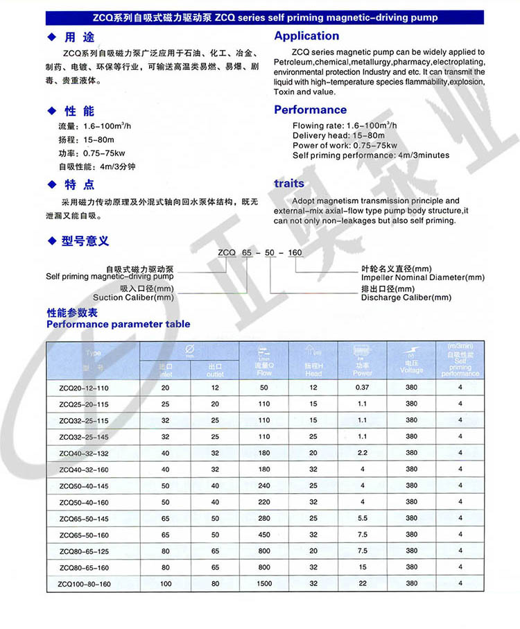 上奧牌ZCQ型自吸式磁力驅動泵(以下簡稱自吸泵)該泵以靜密封取代動密封,使泵的過流部件處于完全密封狀態,解決了其它泵機械密封無法避免的跑、冒、滴、漏之弊病,泵體及過流部件的材料均采用了耐腐蝕的不銹鋼、鋼玉陶瓷、四氟石墨等材料制造,既有CQ型磁力驅動泵的功能,又集皂吸于一身,不需底閥和引灌水,自吸高度4米。