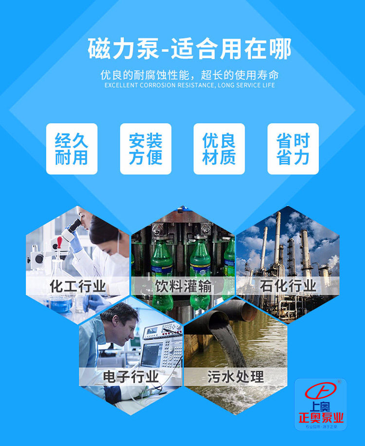 該泵結構緊湊,外形美觀,體積小,噪音低,運行可靠,使用維修方便,可廣泛用于石油、化工、制藥、電鍍、印染、食品、科研等單位抽送酸、堿、油類及稀有貴重液、毒液、揮發性液體,以及循環水設備配套,特別是易漏、易燃、易爆液體的抽送。