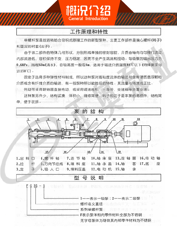 G型整體不銹鋼單螺桿泵是按迥轉嚙合容積式原理工作的泵種,主要工作部件是偏心螺桿(轉子)和固定的襯套(定子)。由于該二部件的特殊幾何形狀,分別形成單獨的密封容腔,介質由軸向均勻推行流動,內部流速低,容積保持不變,壓力穩定,因而不會產生渦流和攪動。每級泵的輸出壓力為0.6MPa,揚程60m(清水),自吸高度一般在6m,適用于輸送介質溫度80℃以下(特殊要求可達150℃)。