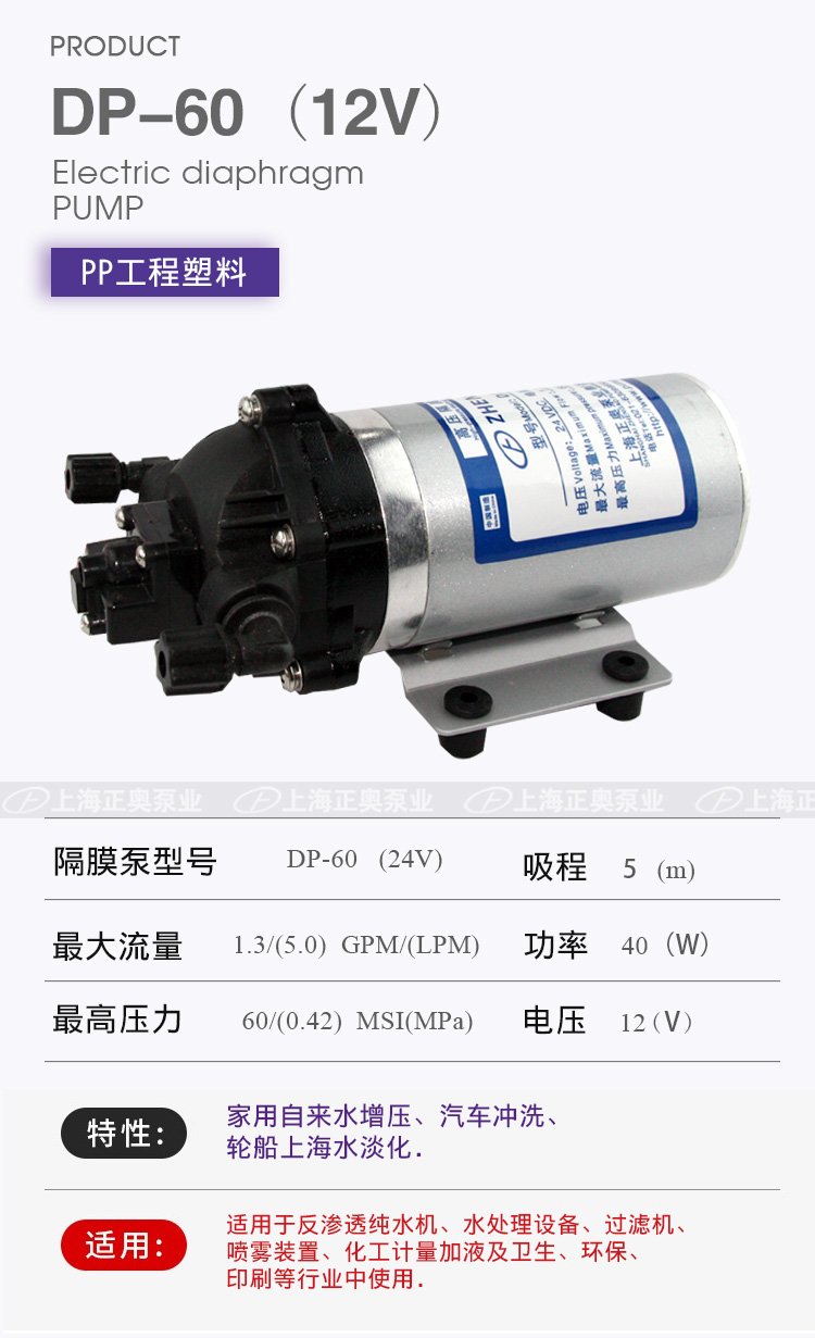 DP微型電動隔膜泵適用于家用自來水增壓、汽車沖洗、輪船上海水淡化,DP隔膜泵適用于反滲透純水機、水處理設備、過濾機、噴霧裝置、化工計量加液及衛生、環保、印刷等行業中使用。