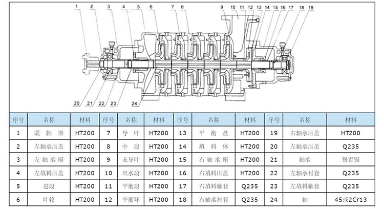 臥式多級離心泵系列臥式、單吸多級、分段式結構系列產品。具有效率高,運行噪音低,抗汽蝕性能好,結構合理,使用壽命長等顯著優點。主要輸送清水或物理化學性質類似于水的其他液體。產品執行JB/T1051-93《多級離心泵型式與基本參數》標準。